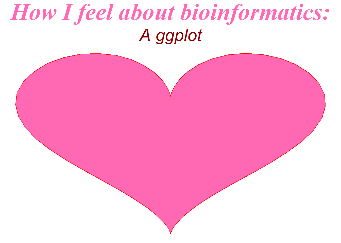 library(ggplot2)dat<-data.frame(t=seq(0, 2*pi, by=0.1) ) xhrt <-function(t) 16*sin(t)^3 yhrt <-function(t) 13*cos(t)-5*cos(2*t)-2*cos(3*t)-cos(4*t) dat$y=yhrt(dat$t) dat$x=xhrt(dat$t)options(repr.plot.width =2, repr.plot.height =2)theme_set(theme_void())heart =ggplot(dat, aes(x=x, y=y)) +geom_polygon(colour="red",fill="hotpink") +labs(title ="How I feel about bioinformatics:", subtitle ="A ggplot") +theme(plot.title =element_text(family ="serif", size=35,color ="hotpink", face ="bold.italic", hjust =0.5),plot.subtitle =element_text(size =25, face ="italic",hjust =0.5, color ="darkred"))heart